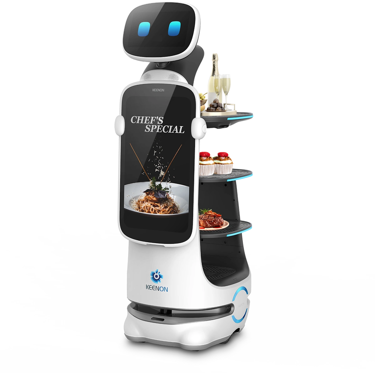 Keenon hat sein neuestes Model mit zusätzlichen Sensoren an den Seiten ausgestattet. Dadurch übersieht der Roboter lückenlos den gesamten Fahrbereich und weicht Hindernissen auch unter beengten Verhältnissen souverän aus. Damit setzt der Keenon T10 neue Maßstäbe für Serviceroboter im Gastgewerbe.